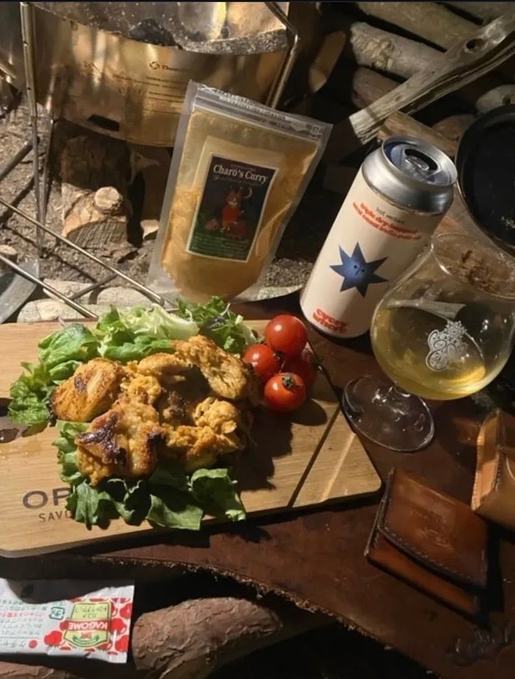 設営後、鶏もも、スパイスカレーキット、ヨーグルト、ケチャップ、塩をジプロックに入れ混ぜ混ぜして漬け込み